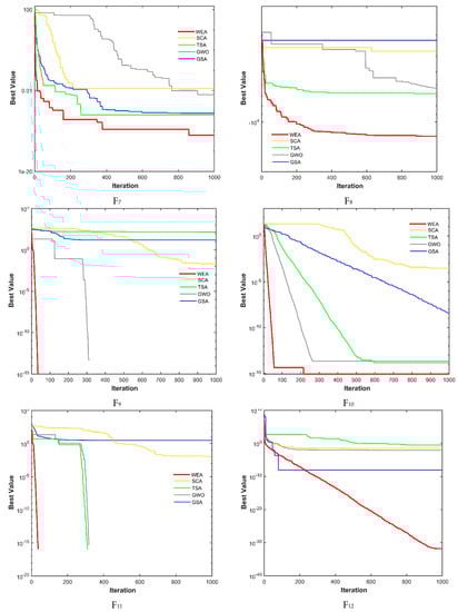 A successful optimization technique needs to reach the global best solution rather than settling for a local optimum in early iterations. In Figure 4, the convergence progress curves of the WEA are compared to GSA, SCA, TSA, and GWO for certain benchmark test functions. The curves are displayed versus the number of iterations, which ranges from hundreds to thousands.