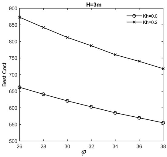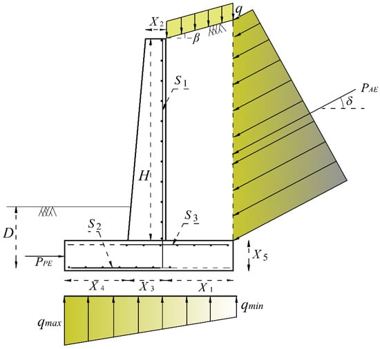 The Mononobe-Okabeh (M-O) is a common pseudo-static technique for determining the distribution of earthquake pressure [88]. A one-meter-long retaining structure subject to general forces is shown in Figure 5. The active and passive earth pressures under earthquake loads are shown in this figure as PAE and PPE, respectively. H stands for the wall’s overall height, β for the angle of backfill slope, D for the soil depth, q for the surcharge load, and qmin and qmax for the contact pressure’s minimum and maximum values.