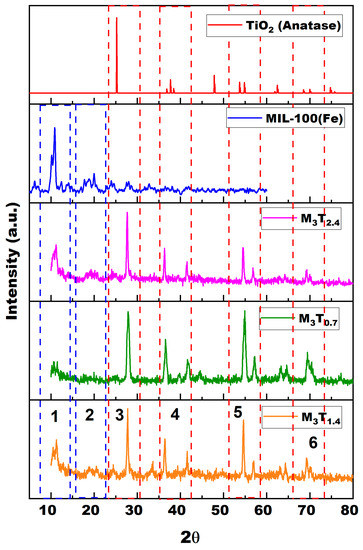 The crystallinity and phase purity of the obtained MxTy and TiO2 (anatase) were measured using X-ray diffraction (XRD) (Figure 2). According to the XRD diffractograms, each synthesized MxTy resembled pristine MIL-100(Fe) peaks at 2 angles of 11° and 20°, excluding M3T0.7. This resemblance also corresponded to the theoretical MIL-100(Fe) single-crystal XRD pattern based on CCDC 640,536 [12]. Other than MIL-100(Fe) peaks, the obtained MxTy also exhibited some key TiO2 anatase peaks at 2 angles of 28°, 36°, 56°, and 70°. These peaks corresponded to the (101), (211), and (204) crystal planes of TiO2 (anatase) and fit the TiO2 (anatase) simulated card (ICSD-50447) [13]. However, there was a slight shift within the observed peaks on the composite, compared with its pristine component. This can result from the increasing or decreasing band gaps, which is possible when two materials are combined. We can still safely assume that the peak shown on the composite was the peak of the pristine component because the shifting was consistent within each peak. With these two indicators present in the obtained MxTy, the XRD pattern provided sufficient evidence of TiO2 characteristic peaks in the MxTy crystalline.