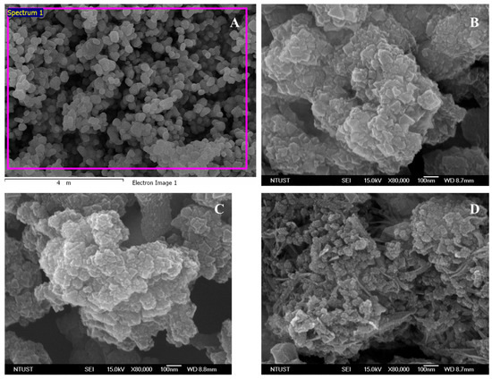 SEM images of (A) TiO2 anatase; (B) M3T0.7; (C) M3T1.4; (D) M3T2.4.
