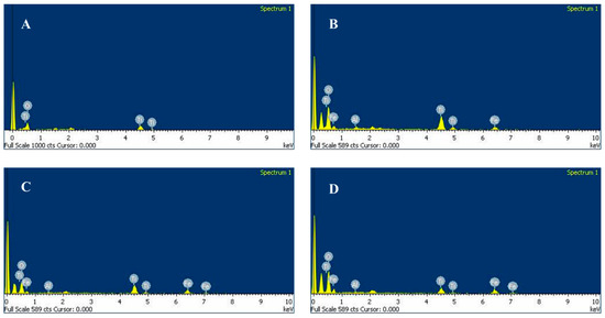 EDXS pattern of: (A) TiO2 anatase; (B) M3T0.7; (C) M3T1.4; (D) M3T2.4.
