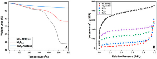To further clarify the presence of each pristine MIL-100(Fe) and TiO2 anatase inside the composite, the thermogravimetric analysis (TGA) was conducted, and is shown in Figure 5A. A weight loss around 200 °C was assigned to the removal of water molecules plus the desorption of ligand from the surfaces of the nanocrystals [10]. The decomposition of carboxylic acid was observed between 245–450 °C, which corresponded to the composite framework’s collapse. When heated further, well over 450 °C, the TiO2 anatase exhibited great thermal stability. In the M3T1.4 curve, we can see that the graph is more stable at high temperatures than pristine MIL-100(Fe), which indicates that the stability must come from the TiO2 anatase presence within the M3T1.4. To study the pore structure of the synthesized materials, nitrogen sorption analysis was conducted, and is shown in Figure 5B. From the N2 sorption result shown in Figure 5B, the TiO2 anatase exhibited type II isotherm, and the composite isotherm exhibited type I and IV isotherm. The surface pore area was calculated, and is shown in Table 3. According to those results, the optimum ratio for MIL-100(Fe) and TiO2 to create the most significant surface area, which will benefit the application towards adsorption and photocatalytic degradation, was M3T1.4.