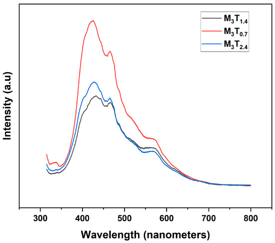 The photoluminescence spectra (PL) for each MxTy were investigated from 300 nm to 800 nm (Figure 6). Guo et al. [14] reported that the lower the PL intensity obtained, the more efficient the transfer of the photoinduced carriers and their generation inside the whole system. Distinctly, M3T1.4 showed the lowest PL curve, with M3T2.4 showing the highest PL curve. This phenomenon shows that M3T1.4 provided significantly enhanced separation efficiency and reduced recombination rate of the excited electron-hole pairs, the most suitable/profitable to use in the photocatalytic degradation system.