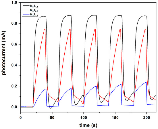 The stability of the synthesized MxTy under visible light irradiation was studied using the transient photocurrent tests. The experiments were recorded under visible light irradiation, which was switched on and off regularly. As shown in Figure 7, the photoexcited electrons that produced the photocurrent were observed when the light was turned on. The photo-generated carriers’ better separation efficiencies and a longer lifetime is indicated by higher photocurrent density [14]. M3T1.4 exhibited higher photocurrent density than other ratios, indicating that M3T1.4 can provide good separation efficiencies and a longer photo-generated carrier’s lifetime than other synthesized ratios.