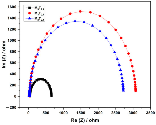 The impedance of the photoanodes was used to examine the charge transport capability, and electron impedance spectra (EIS) tests were conducted. A smaller arc diameter at high frequency implies high efficient charge separation and electron transfer [14]. As shown in Figure 8, M3T1.4 also exhibited a smaller arc diameter than other MxTy, indicating efficient charge separation and electron transfer capability of the material compared with other MxTy. The EIS results were consistent with the PL and transient photocurrent tests, indicating the highest photocatalytic capability efficiency of the M3T1.4 under visible light irradiation.