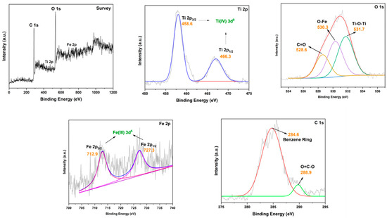 The chemical bonding of MIL-100(Fe) and TiO2 atoms was characterized using XPS (Figure 9). The full survey spectrum of XPS distinctly disclosed the existence of Fe, O, Ti, and C elements. The high-resolution spectra of O1s, Ti2p, and Fe2p are also shown in Figure 8. In the spectrum of O1s, peaks at 528.6, 530.3, and 531.7 eV were assigned to C=O bonding (carboxyl group in benzene tricarboxylic acid), O-Fe bond (ligand bonding with the metal), and Ti-O-Ti bond (from TiO2 molecules) [10]. Peaks at 458.6 and 466.3 eV in the spectrum of Ti2p corresponded to Ti 2p3/2 and Ti 2p1/2, respectively. The binding energy difference of 7.7 eV between Ti 2p3/2 and Ti 2p1/2 showed the chemical state of Ti4+ in MIL-100(Fe)@TiO2 materials [15]. In the Fe2p spectrum, two peaks were observed at 712.9 and 727.3 eV, which were assigned to Fe 2p3/2 and Fe 2p1/2. Therefore, the chemical state of Fe(III) was present in MIL-100(Fe) [16]. Peaks at 284.6 eV and 288.9 eV in the spectrum of C1s corresponded to the benzene ring (from the benzene tricarboxylic acid) and a carboxyl group. XPS analysis provided sufficient evidence for the chemical interaction between MIL-100(Fe)@TiO2 molecules.