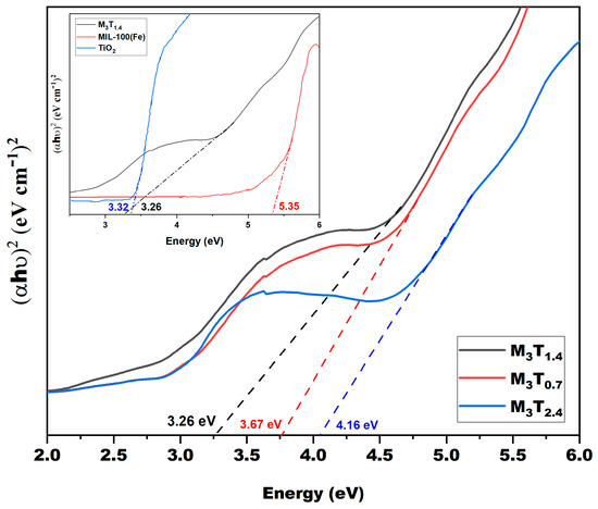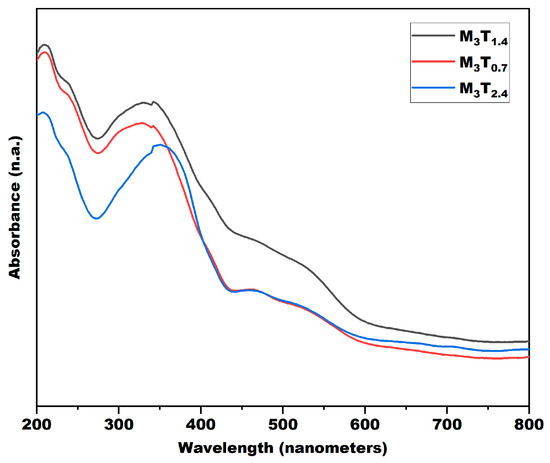 The optical absorption capability of synthesized MxTy was investigated using UV-Vis DRS. As seen in Figure 10, M3T1.4 exhibited a higher and broader spectrum than other MxTy, indicating that M3T1.4 can be considered an optimum metal-to-TiO2 ratio for its ability to absorb lightwaves. The optical band gap of each MxTy was calculated using the Kubelka–Munk function versus the energy of absorbed light [17]. Figure 10 shows that the optical band gap of M3T1.4 was around 3.26 eV, M3T0.7 was around 3.67 eV, and M3T2.4 was around 4.16 eV. Figure 11 shows the Tauc plot obtained from UV-Vis DRS spectra of each precursor, as well each synthesized ratio.