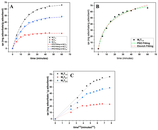 Adsorption kinetics models (A) each component towards PFO equation; (B) M3T1.4 towards other kinetic models; (C) intra-particle diffusion models.