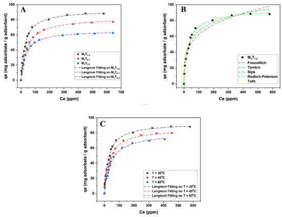 Adsorption isotherm models: (A) each component towards the Langmuir model; (B) M3T1.4 towards other isotherm models; (C) at different temperatures.