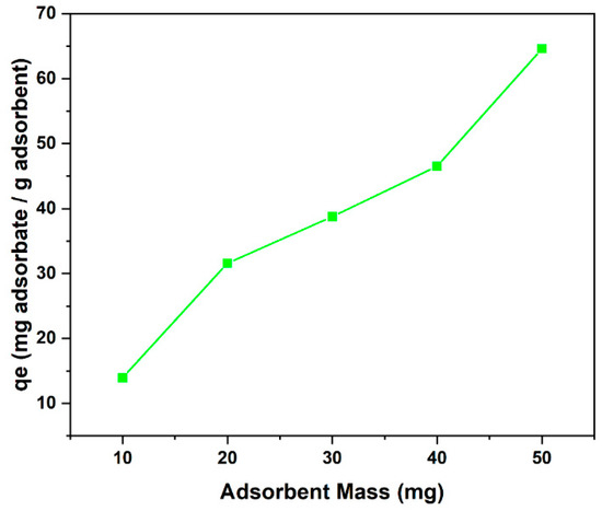 The effect of the adsorbent loading on the adsorption capacity was investigated in this study. As shown in Figure 14, the adsorption capacity towards RhB after 60 min increased when the adsorbent dose increased from 10 to 50 mg. This result indicated that more surface area and active sites were available with increasing adsorbent dosage in the adsorption system.