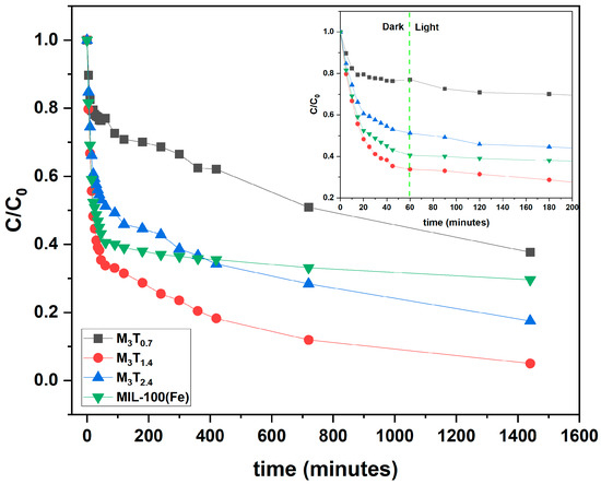Different ratios of the MIL-100(Fe) and TiO2 in the composite could impact the material’s porosity, thus, impacting its transfer efficiency and accessibility of the active sites for photocatalytic degradation. This occurrence was studied by varying the mole ratio of TiO2 (0.7; 1.4; and 2.4) incorporated into the constant amount of MIL-100(Fe) (denoted as M3T0.7; M3T1.4; and M3T2.4). The suitable amount of TiO2 inside the composite could enhance the photoreactivity of the composite by increasing the specific surface area and promoting charge transfer [13]. The results of this study are shown in Figure 15. As shown in the figure, M3T1.4 exhibited the best performance on the overall degradation of RhB in the aqueous system. The results also indicated that high TiO2 content leads to catalyst aggregation, which lowers active sites, and reduces light penetration, and scattering [13].
