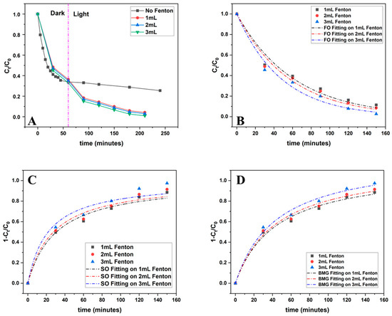 (A) Effect of each Fenton volume towards RhB adsorption and photocatalytic degradation (B) FO kinetic fittings on each Fenton volume; (C) SO kinetic fittings on each Fenton volume; (D) BMG kinetic fittings on each Fenton Volume.