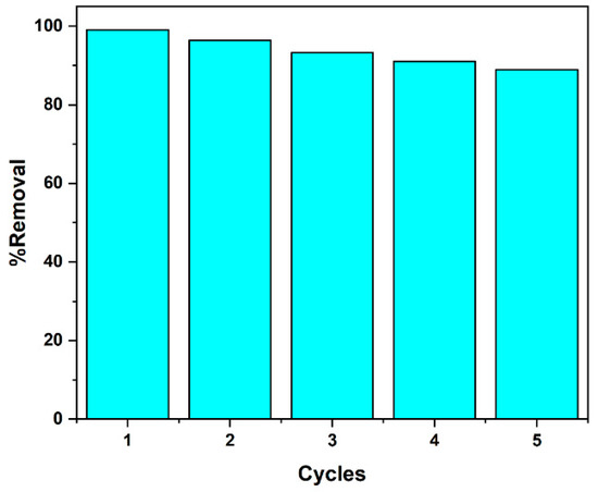 The reusability potential of the composite was investigated in this study for five cycles of adsorption–photodegradation of RhB. The experiments were conducted as follows: after adsorption–photodegradation, the adsorbent was soaked in ethanol (24 h), and centrifuged, then dried at 80 °C for 6 h. Subsequently, the adsorbent was used in the next cycle. Based on the results shown in Figure 18, the removal percentage of the RhB slightly decreased after five cycles, indicating the stability of composite as the adsorbent.