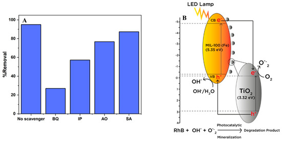 From the UV-Vis DRS characterization in Table 3, a high band gap value of MIL-100(Fe) (5.35 eV) may restrict the excitation of the electron processes, which decreases its capability in photocatalytic degradation. However, the M3T1.4 composite exhibited the lowest band gap energy value (3.26 eV) compared with the other ratios, including its precursor (pristine MIL-100(Fe) and TiO2 anatase). These results showed that the M3T1.4 composite successfully improved the photocatalytic degradation capability, corresponding to its lower band gap value. Therefore, a plausible mechanism of photocatalytic degradation has been shown (in Figure 19B), with the further explanation as follows: (1) visible light irradiation gives sufficient energy for the electrons () from MIL-100(Fe)’s conduction band to jump/migrate into the TiO2’s conduction band; (2) the excitation of the electrons creates holes () on the TiO2’s valence band, which then migrate into the MIL-100(Fe)’s valence band; (3) this repeating process allows photo-excited electrons () and holes () to contact with oxygen and water molecules, respectively; (4) after contact with photo-excited electrons and holes, oxygen molecules create while water molecules create [8]; (5) these free radicals will then degrade the organic pollutant and turn it into mineralization products, such as carbon dioxide and water.