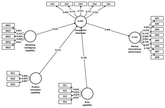 As previously mentioned, we performed PLS-SEM to examine our hypotheses, for this, a bootstrapping was used of 5000 subsamples, this technique was performed used to estimate summary statistics, such as the mean or standard deviations, considering that it is the most approved setting for PLS-SEM [137]. As seen in Table 5, the capabilities of product innovation, marketing intelligence, and price are firmly related to the variable of competitive advantage; in other words, hypotheses H1, H2, and H3 are supported. Additionally, Table 5 shows that competitive advantage is also firmly connected to the international performance of startups; as a result, hypothesis H4 is also supported. The variance inflation factor (VIF), which was also examined to identify if our result has multicollinearity problems, demonstrates that it is not a problem between the exogenous latent constructs. Every VIF value that is not a problem is between 1 and 2, below 5. In the case of the R square values in Table 5, our model explained 29.2% of the competitive advantage variance and 16.2% of the international performance of the startups, which means that this model fits our data very well because the predictive relevance confirms the rule of thumb that says it must not be negative [137].