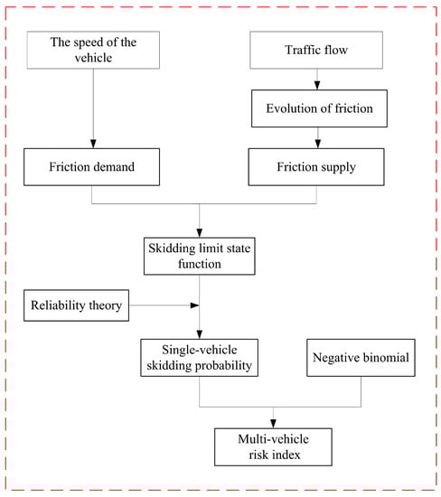 A risk-assessment framework is developed by combining reliability theory and negative binomial to investigate the influence of friction coefficient evolution due to traffic, and it is shown in Figure 1. The friction demand mainly depends on the speed of vehicles. The road friction evolution model proposed by Hofko, et al. [16] is utilized to determine the friction supply. Then a skidding limit state function is set up by difference between the friction supply and the friction demand. After that, the reliability theory is used to calculate the single-vehicle skidding probability (SSP). Finally, a multi-vehicle risk index is developed by SSP and a negative binomial. The specific process is described in detail as follows.