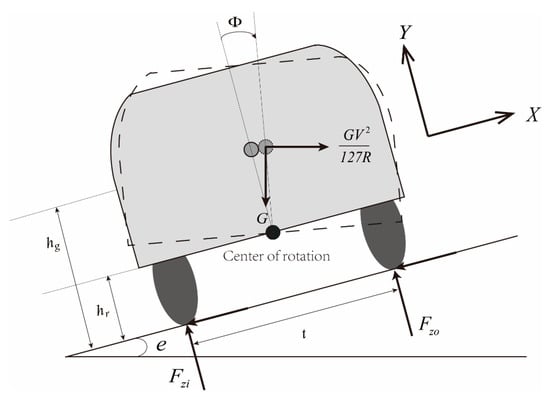 However, all vehicles now have a suspension system. When the vehicle traverses a horizontal curve, the suspension system will rotate outward under the action of centrifugal force. The force diagram is shown in Figure 2. In order to improve the defects of the point-mass model, Chang [23] analyzed the mechanical stability of a vehicle with a suspension system when driving in a curve, and derived a radius based on the vehicle’s sideslip stability, which is given by