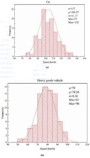 Laser guns were used to collect the speed of cars and HGV. During the data collection process, the experimenters concealed themselves in the bushes beside the motorway to prevent the driver from disturbance. A total of 117 samples of cars and 79 of HGV are effectively collected in the experiment. The specific information of the data is shown in Figure 3. Velocity mean and standard deviation of car are 103.27 and 11.17, which is employed in model Z1 and Z1 for the car. The counterparts of HGV are 78.56 and 9.38, utilized in model Z1 and Z1 for HGV. The Kolmogorov–Smirnov test results of the speed data are shown in Table 2. The two-tailed asymptotic significance value is 0.2, which is greater than 0.05. Therefore, it could be considered that the speeds of cars and HGV have a normal distribution in a statistical significance. This finding was consistent with Sil, et al. [30] and Himes [31].