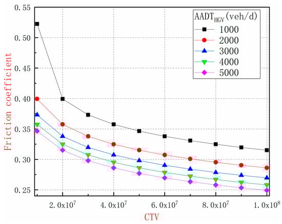 Moreover, the impacts of AADTHGV on friction coefficient is more substantial for a higher CTV (e.g., CTV over 40 million vehicles). When CTV exceeds 20 million vehicles, most of the curves tend to be parallel. Pavement friction coefficient in these curves with AADTHGV = 5000 veh/d is only 80% of AADTHGV = 1000 veh/d for a certain value of CTV. This result verifies the point that the friction coefficient of the road is significantly affected by the truck [1,32]. Therefore, freeways with numerous truck volumes need more road maintenance work to ensure that the road can provide sufficient friction coefficient for vehicles.