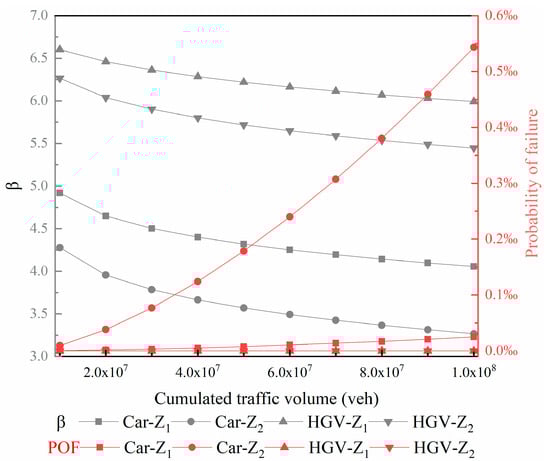 An interesting finding is that the failure probability difference between Car-Z1 and Car-Z2 becomes more and more significant as the road operation time goes. When the CTV is equal to 100 million vehicles, the skidding probability for Car-Z2 is about 22 times that of the Car-Z1. It not only demonstrates that traditional road design theory underestimates the risk of cars, but also that the hidden dangers caused by such underestimation will be magnified over time.