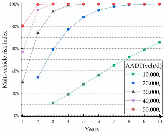 The truck traffic volume is assumed as a determined value (AADTHGV = 2000 veh/d) to analysis the impact of AADT for safety on the horizontal curve over time. Figure 6 exhibits the multi-vehicle risk index of the varying AADT changes over the years. It is found that the safety on the horizontal curve is very sensitive to the AADT. Among these five traffic characteristics, the AADT with a value of 10,000 veh/d has the least threat to vehicle accident risk. Although for a curve with a heavy traffic volume (e.g., AADT over 30,000 veh/d), the multi-vehicle risk index (MRI) rises rapidly to 100% after four years, indicating that the road has not be maintained during this period, the probability that one or more cars skid will reach to 100%. Therefore, this result suggests that the freeway with heavy traffic flow need to be frequently maintained.