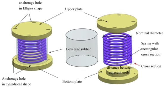 As shown in Figure 1, the spring re-centering device is composed of three parts: spring, rubber, and the base system. In this re-centering device, the spring has a rectangular cross-section. The re-centering stiffness is changed by composing multilevel springs with different nominal diameters, which are nested on a flange with several layers. All of these springs are considered to be reliably connected to the base system (the upper and bottom plates), i.e., welded to the flange. Then, the spring system is covered by rubber which protects the spring system from erosion and ensures the spring’s stability. Additionally, the reinforced rubber also provides resisting stiffness when the spring re-centering device deforms laterally.