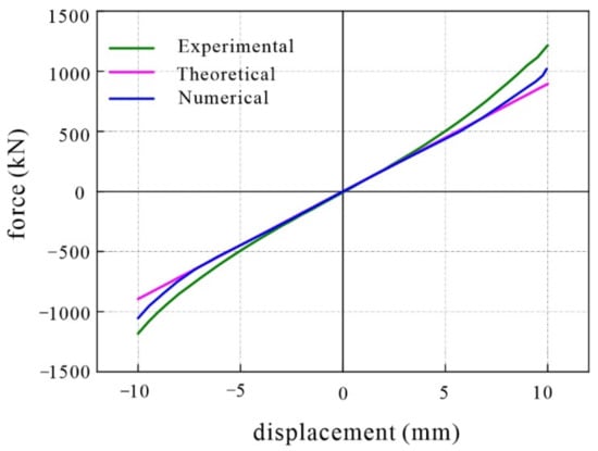 This process was also analyzed on ANSYS platform. Specifically, element type SOLID95 was used to model the characteristics of the spring. The connection between springs and the forcing plate was modelled by Targel170 and Conta174 where the characters were determined by penalty function. The ends of the spring were fixed to steel plates at the sides. Then, the whole calculation domain was meshed into 69,120 elements with 377,850 nodes. After that, the force–displacement relationships from experimental, analytical, and theoretical approaches are plotted in Figure 3. It indicates that there are some discrepancies between them when the displacement is large. This phenomenon is attributed to the coupling effects of geometry variation and material deformation. Additionally, the practical spring provides a higher restraint stiffness than the theoretical value, which will cause a conservative re-centering effect. On the other hand, the rubber coverage provides protects to springs and avoids unstable geometry deformation. Thus, the reliability of the working states could help mitigate the discrepancies. And, the following theoretical equation can be applied to estimate the lateral spring stiffness.