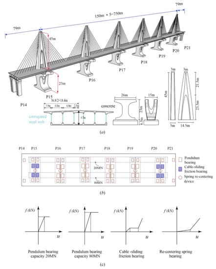 To evaluate the re-centering effect, a six-pylon extra-dosed cable-stayed bridge [36] was selected as an example for analysis. The symmetrical pylons of the bridge are fixed to the girder, where the girder is supported by bearings. The hybrid concrete box girder has a total length of 908 m and a width of 36.8 m. The reinforced concrete pylon was designed in a herringbone pattern in the longitudinal direction with a height of 45 m, and has nine sets of double-cable planes on each side to aid in reinforcing the girder. The average height of the reinforced concrete piers is 23 m. To avoid damages caused by extreme relative displacement between the girder and piers, 4 cable-sliding friction aseismic bearings [37] were introduced to P15 and P20, as shown in Figure 4.