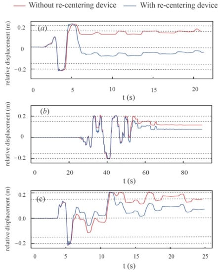The maximum girder displacement in Table 3 indicates that girder displacements are similar between cases with and without the spring re-centering device. The restraints from substructures are limited when the re-centering device is installed. Figure 5 compares the relative displacement between pier P15 and decks with the excitation of earthquake waves in Table 2. We can find that the time history is almost same at the beginning, but severe discrepancies are observed at the end. The residual displacements decrease with the present spring re-centering device. This means that the restoring force works to restrict further movement when the relative displacement exceeds the initial free distance.