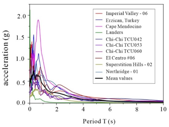 To analyze the influence of the critical parameters of the spring re-centering device (initial slack and stiffness) on seismic response, an additional set of earthquakes were selected from the PEER database and a total of 10 corresponding pseudo-acceleration spectrums are depicted in Figure 7. An optimal design was carried out to investigate the impact of the critical factors. Specifically, a total 200 nonlinear time–history analysis was conducted with initial free distances 0 cm, 5 cm, 10 cm, and 15 cm, and the stiffnesses 5 MN/m, 10 MN/m, 20 MN/m, 40 MN/m and 80 MN/m.
