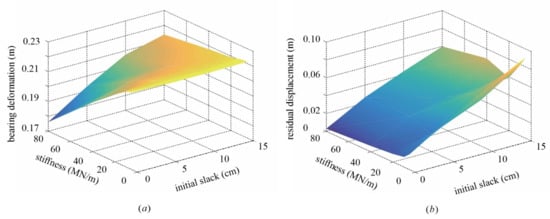Figure 8 indicates that the relative and residual displacement between the girder and piers increases with the rise of the initial slack values and decreases when it is constructed with a larger re-centering stiffness. We found that the bearing deformation was significant, with low restraint stiffness for all the tested initial free distances in Figure 8a. The effect of restraint stiffness has limited influence when there is a large initial slack. This means that the re-centering device does not work sufficiently and has limited impact on seismic responses. However, for the residual displacement, it increases sharply and has little impact with the restraint stiffness. It was observed that the mean residual displacement is positive around the initial slacks.