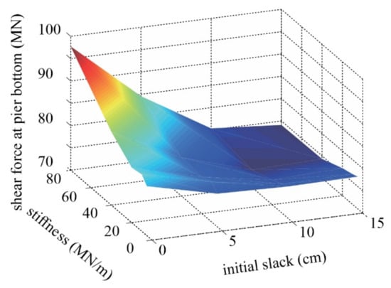 The shear force also varies with changes in initial slack and re-centering stiffness. As shown in Figure 9, there is a peak value of shear force with a 0 cm free distance and high restraint stiffness. This decreases quickly with the increase of initial free distances. For example, the shear force does not change much when the initial free distance is ranging from 10 cm to 15 cm. There is a minimum value with restraint stiffness of 40 MN/m. Additionally, the slight restraint stiffness has a limited effect on the variation of shear forces.