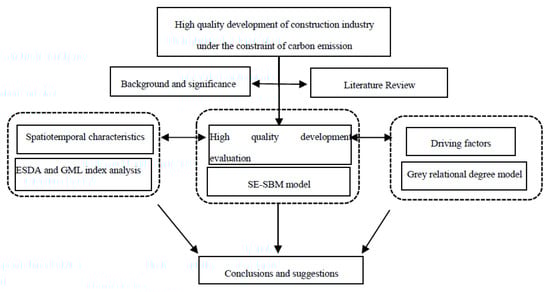 This paper analyzes the high-quality development of China’s construction industry from the perspective of “carbon emission constraints”, discusses the connotation of high-quality development of the construction industry, constructs an index system under the dimension of “carbon emission constraints”, and reveals the spatial–temporal heterogeneity, dynamic trend evolution and driving factors of high-quality development evaluation of the construction industry from 2006 to 2021 under environmental constraints by using the SE-SBM model of unexpected output, coefficient of variation and grey correlation model. This not only provides a new idea for the connotation and index system construction of high-quality development in other industries under low-carbon conditions, but also provides a reference for the improvement of the connotation and index system of high-quality economic growth in China (Figure 1 Structural frame diagram).