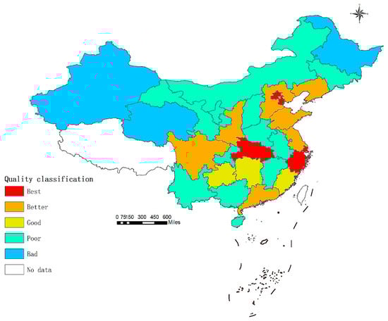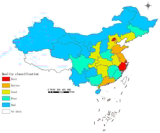 - The high-quality development level of China’s construction industry has been improved as a whole. It can be seen from Figure 2 that from 2006 to 2018, there were many provinces with poor quality of high-quality development of China’s construction industry, but by 2021, only Heilongjiang and Qinghai had poor quality of construction industry (Figure 3. shows high-quality development of China’s construction industry in 2021). The development quality of most construction industries has improved a lot, and the high-quality development with poor quality has developed to a higher level of quality. For example, Hubei and Tianjin have changed from good-quality development to better development; the quality of high-quality development in Xinjiang, Ningxia, Gansu, Yunnan and Guangxi has changed from bad quality to poor quality; the high-quality development of the construction industry in Henan and Anhui provinces had changed from poor quality to good quality. On the whole, the high-quality development level of the construction industry has significantly improved.