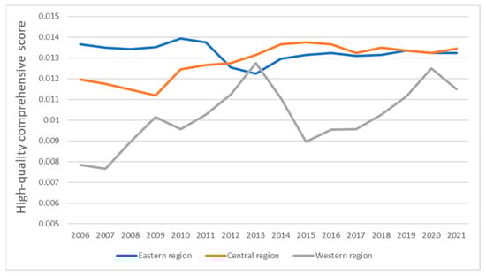 Figure 4. Comprehensive scores of high-quality development in the Eastern, Central and Western Regions.