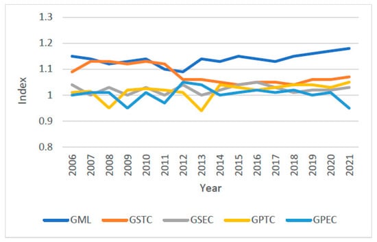 where: GPEC indicates the change of net efficiency. GPEC > 1 indicates that the efficiency of production activities improves between t and t + 1 periods; GPTC indicates pure technological progress, and GPTC > 1 indicates that compared with phase t production technology, phase t + 1 is closer to the global production technology, indicating technological progress; GSTC indicates the change of technology scale, and GSTC > 1 indicates that the return to scale of technology deviation remains unchanged, which measures the scale effect of technological progress; GSEC indicates that the change of scale efficiency is the scale effect caused by the change of efficiency. GSEC > 1 indicates the improvement of scale efficiency; GPEC > 1, GPTC > 1, GSTC > 1 and GSEC > 1 can promote the improvement of GML index.