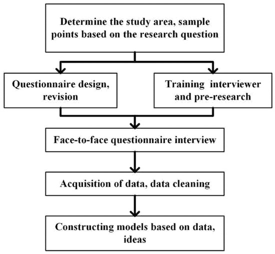 Then we randomly selected 15 rural households from each of the villages, totaling 450 interviewed rural households. We conducted the interview from the end of 2019 to the summer of 2020. The survey duration of each household was more than half an hour, and the questionnaire was divided into three main parts: basic household information, household assets and household livelihoods. The household assets section mainly included land resources and management, household social capital, household physical capital and household financial capital. The household livelihood section mainly included household production and household consumption. The whole process of data collection is shown in Figure 3. First, we determined the research area and sample points based on the research questions, then we designed the questionnaire and trained the researchers, then the researchers started the face-to-face questionnaire interviews, and finally we organized the obtained data and constructed the model based on the data. After removing some samples with missing information, a total of 382 valid samples were collected.