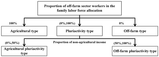 The definition of the livelihood strategy was carried out as follows. Classifying livelihood strategies and investigating livelihood strategy shifts among farm households in a systematic and quantitative manner is important for understanding rural livelihood dynamics, livelihood strategy choices and for formulating effective rural development strategies. First, according to the proportion of off-farm employment in the household labor allocation, it is preliminarily divided into agricultural type, pluriactivity type and off-farm type. In detail, if the proportion of off-farm employment in the household labor allocation is 100%, then the household livelihood strategy is off-farm type. Conversely, if the proportion of off-farm labor is 0%, then the household livelihood strategy is agricultural type. If the proportion is between 0% and 100%, then the household belongs to a pluriactivity type. The next step of classification is to divide the pluriactivity-type household according to the proportion of off-farm income in the household income structure. If the proportion of off-farm income is less than 50%, the household is agricultural pluriactivity type. And if it is between 50% and 100%, the household belongs to off-farm pluriactivity type. According to the above-mentioned steps, the household numbers of agricultural type, agricultural pluriactivity type and off-farm pluriactivity type were 46, 110 and 66, respectively. However, the off-farm type accounted for the most, reaching 160 households. This is consistent with the actual situation in the survey area. The current livelihood strategies of farmers are diversified, and the phenomena of off-farm or pluriactivity are widespread. This shows that the selection and investigation of samples had a scientific basis. A flow chart showing the household livelihood strategy division is shown in Figure 4.