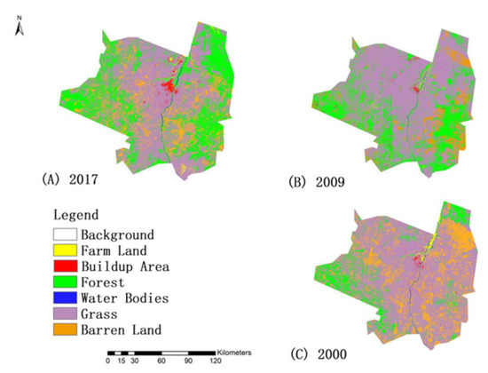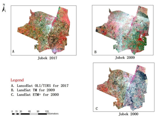 Due to the complex driving force of LULC in the study area, information exacted from the literature was used for interpretation. Thus, it can utilize comprehensive spectral and spatial features of the downloaded Landsat images and thematic information from multiple references during the classification procedure [50]. Based on the Landsat images’ eye observation, training points were marked for each class and crosschecked for verification using a high-resolution image downloaded from Google Earth concerning the selected periods. Each course was created and exported to SVM for each year based on the selected training samples and a signature file. As SVM is most commonly [51,52], it is a post-classification comparison [53]. The resultant thematic maps are compared at pixel bases for the three selected years after each image of one single year was separately classified [54] (Lu et al., 2004). ENVI 5.3, ERDAS 9.2, and ArcGIS 9.3 software were used as a work platform. Interpretation keys were derived from the result of LULC during the study periods, i.e., 2000, 2009, and 2017 Figure 3.