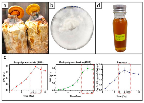 - Hassan, N.A.; Supramani, S.; Sohedein, M.N.A.; Usuldin, S.R.A.; Klaus, A.; Ilham, Z.; Chen, W.-H.; Wan-Mohtar, W.A.A.Q.I. Efficient biomass-exopolysaccharide production from an identified wild-Serbian Ganoderma lucidum strain BGF4A1 mycelium in a controlled submerged fermentation. Biocatal. Agric. Biotechnol. 2019, 21, 101305. [Google Scholar] [CrossRef]
