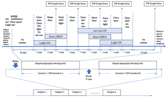 In total, there are nine segments in which the participants’ brain signals are recorded in different environmental conditions. The participants were each assigned a room, in which they were seated, in order to complete a geographically themed pen-and-paper quiz within an hour. Each participant went through two sessions, first with a DIY EEG headset and then with an ANT Neuro EEG headset. During the intervals between the different actions, the participants were also required to fill in a ten-point Likert scale in terms of how they felt mentally and physically. The results were to be compared and classified into segments with machine learning models to determine whether the changes in environmental conditions affected the EEG signals. The channels in the recorded DIY EEG were Fp1—Fp2—C3—C4—T5—T6—O1—O2 (10–20 system), and the equivalent channels in the ANT Neuro EEG headset were Fp1—Fp2—C3—C4—P7—P8—O1—O2 (10-10 system). Figure 4 presents the standard of procedure.