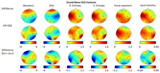The grand mean topography of the EEG signal features extracted from the ANT Neuro and DIY EEG data is presented in Figure 5 along with the “difference” headmaps for comparison. Across different features, there are significant differences in channel P5 (in three features), O2 (in three features), and P6 (in three features), while the grand means for channels Fp2, C3, and C4 are similar between the two types of devices. For skewness and detrended fluctuation analysis, the distributions are somewhat different. However, for the remaining features, both the ANT Neuro and the DIY EEG data were markedly larger over the left-central and right-parietal sites and smaller at the right-frontal and right-central sites.