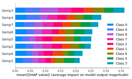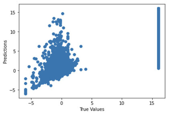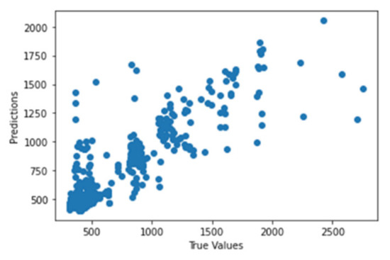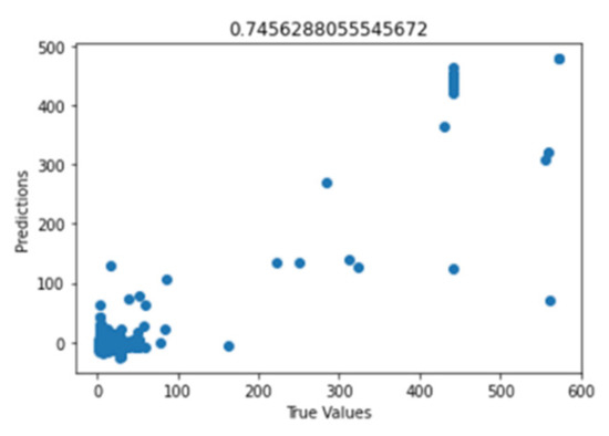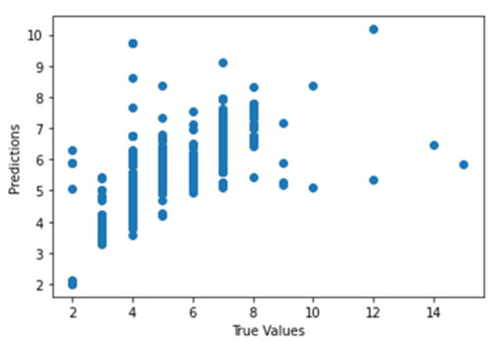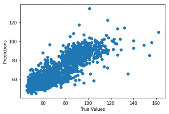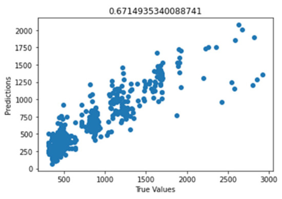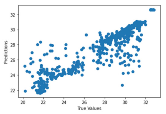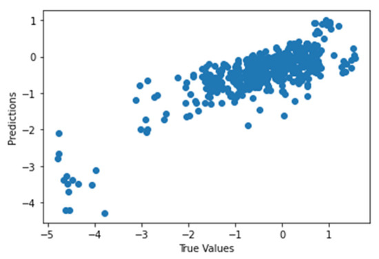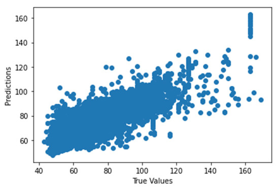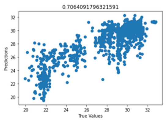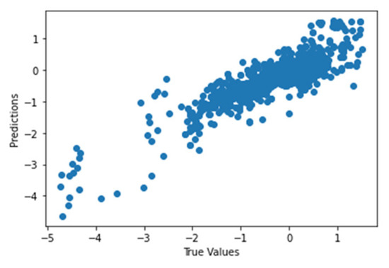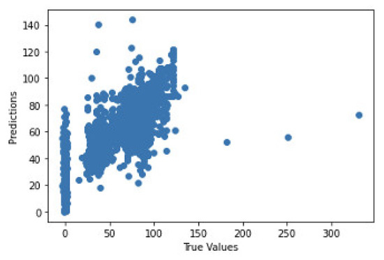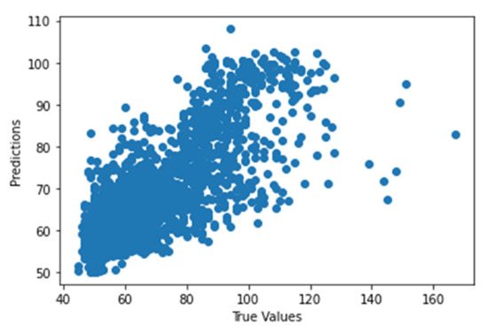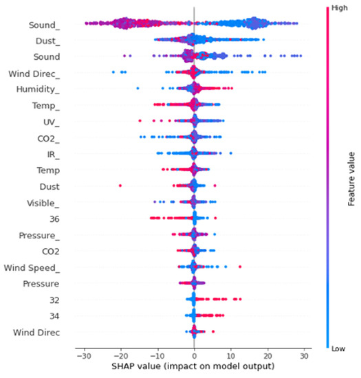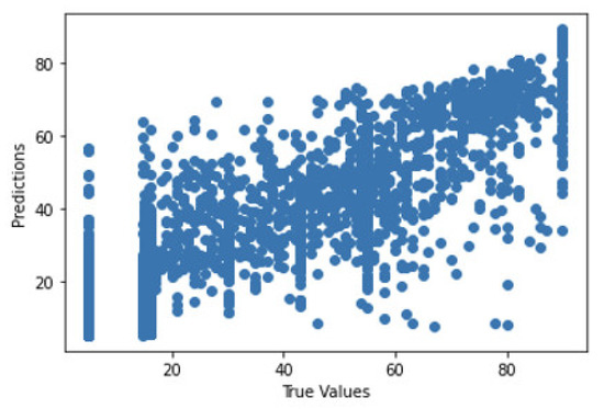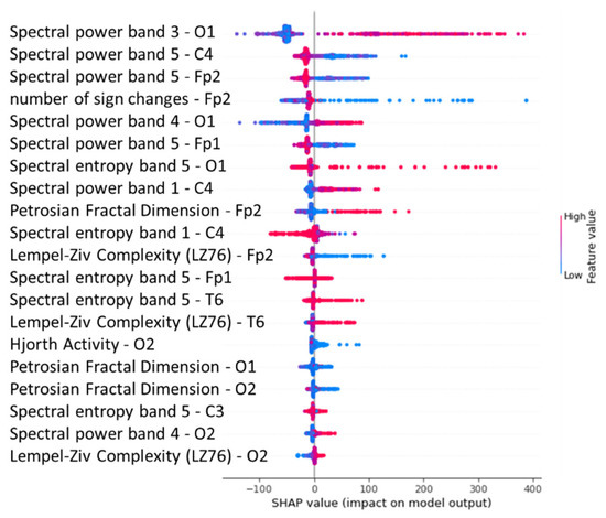 Figure 41 shows the graph of the predicted values against the true values of the feature extraction random forest regression model of EEG—sound intensity, and Figure 42 shows the corresponding Shapley summary plot.