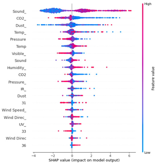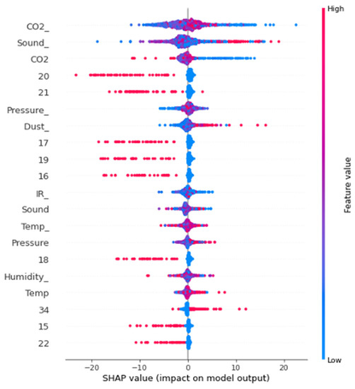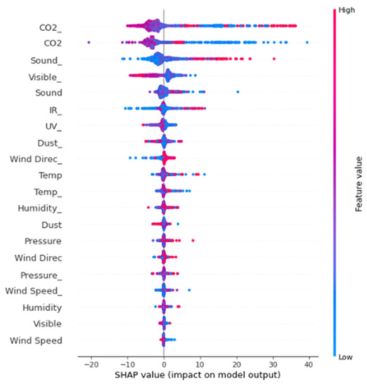 The preceding analysis suggests that the more associative microclimatic factors are dust concentration, ambient temperature, carbon dioxide concentration, and sound intensity. These factors were continually associated with high feature importance scores in the EEG data signal and in both the objective scores recorded from the electronic instruments and the more subjective self-report forms. Furthermore, we have found that visual stimulus and problem processing, in terms of information, touch, and spatial relationships, are the most influential factors affecting the participants’ physiological well-being in this research.