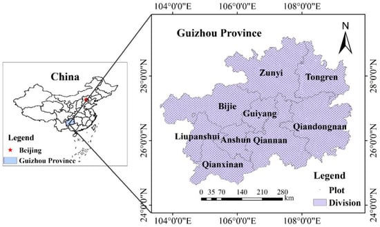 Guizhou province is located in southwest China (24°30′ N–29°13′ N and 103°31′ E–109°30′ E) (Figure 1). It covers an area of 176,128 km2, of which 92.5% is mountainous and hilly, and the area of rocky desertification accounts for 17.1% of the total land area. It has an altitude/elevation of 137–2900 m (an average elevation of 1100 m) [30]. Guizhou province has a humid subtropical plateau mountain monsoon climate, which straddles the Yangtze River and the Pearl River, with an average temperature of 10 °C to 18 °C, annual precipitation of 1000–1500 mm, a relative humidity of more than 70%, a sunshine duration of 1300 h a year, and a frost-free period of approximately 270 days. It has a rock exposure of 109,000 km2, accounting for 61.9% of the province’s land area. Influenced by climate, soil, and mountainous terrain, vegetation types are diverse in the province. The central, northern and southern parts of the province are dominated by subtropical evergreen broad-leaved forests. The central and eastern parts have tropical moist forests, whereas semi-humid forests are found in the western part of the province. Moreover, cold and warm subalpine coniferous forests cover high-altitudinal areas, while karst evergreen and secondary deciduous broad-leaved mixed forests are found in regions of limestone and dolomite [6,31]. There are 269 families, 1655 genera, and 6255 species of vascular plants (excluding bryophytes) in Guizhou Province. The flora is dominated by tropical and subtropical geographical components (http://lyj.guizhou.gov.cn/, accessed on 20 April 2022). Conifer genera such as Pinus massoniana, Cunninghamia lanceolata, Cupressus, Pinus armandii, and Cryptomeria were the main tree species, and broad-leaved genera included Liquidambar formosana, Quercus glauca, Betula luminifera, Quercus acutissima, Quercus fabri, etc.