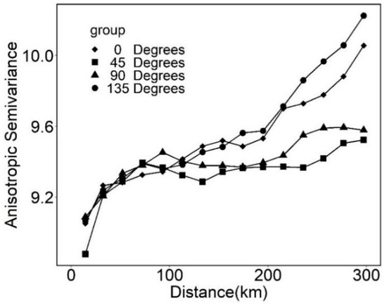 Anisotropic semivariograms for forest biomass in four directions, including east–west (0°), south–north (90°), northeast–southwest (45°), and northwest–southeast (135°) in Guizhou Province.