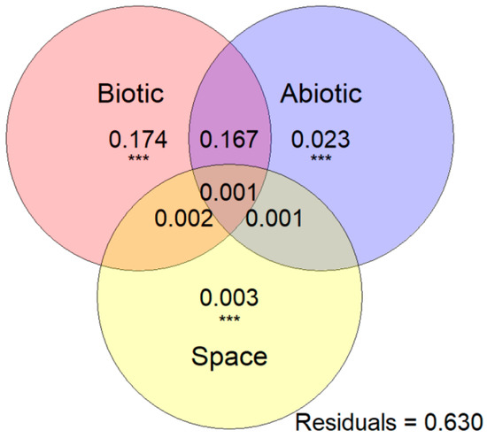 Variance partitioning results for forest biomass among biotic, abiotic, and spatial factors; *** indicates p < 0.001.