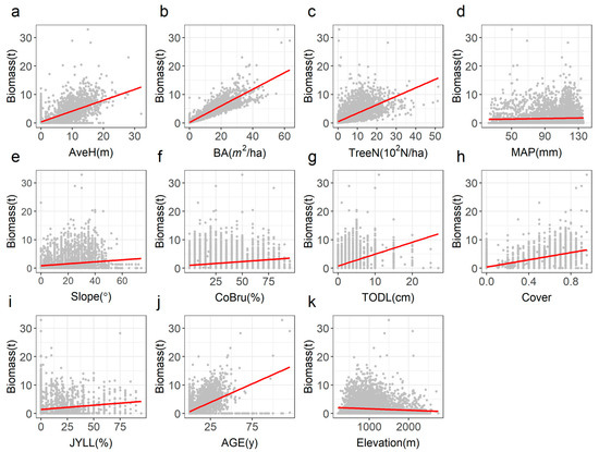 Scatterplots demonstrating the relationships between forest biomass and five biotic factors and six abiotic factors; (a) AveH, average stand height; (b) BA, stand basal area; (c) TreeN, stand density; (d) MAP, annual precipitation; (e) Slope, slope; (f) CoBru, shrub coverage; (g) TODL, the thickness of litter; (h) Cover, canopy density; (i) JYLL, bedrock exposure rate; (j) AGE, stand age; (k) Elevation.