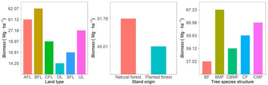Relationships between forest biomass and land type, stand origin, and tree species structure. Land type: AFL; arbor forest land, BFL; bamboo forest land, SFL; shrub forest land, CFL; cash forest land, OL; other forest land, UL; unforested land. Tree species structure: CF; coniferous forest, BF; broad-leaved forest, CMF; coniferous mixed forest, CBMF; coniferous and broad-leaved mixed forest, BMF; broad-leaved mixed forest.
