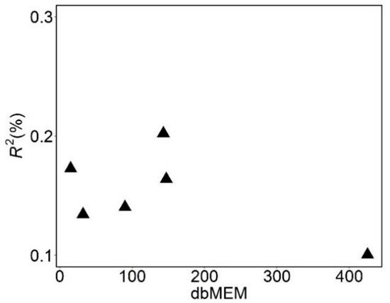 The variation (%) in biomass explained by dbMEM eigenvectors obtained after performing the forward selection procedure and controlling the stand and topographic variables.